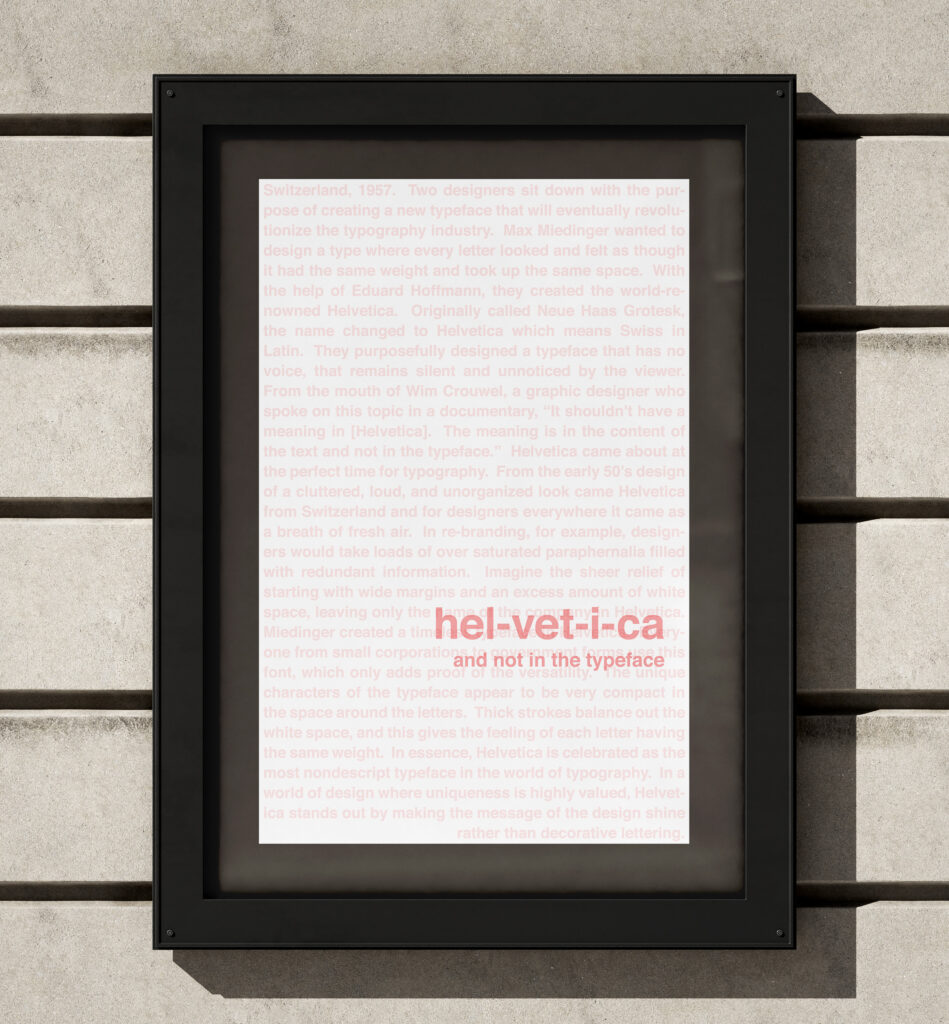 The classic typography poster. Delving into Helvetica’s rich history and understanding its significance served as a catalyst for my own creative process in crafting a unique typography poster.