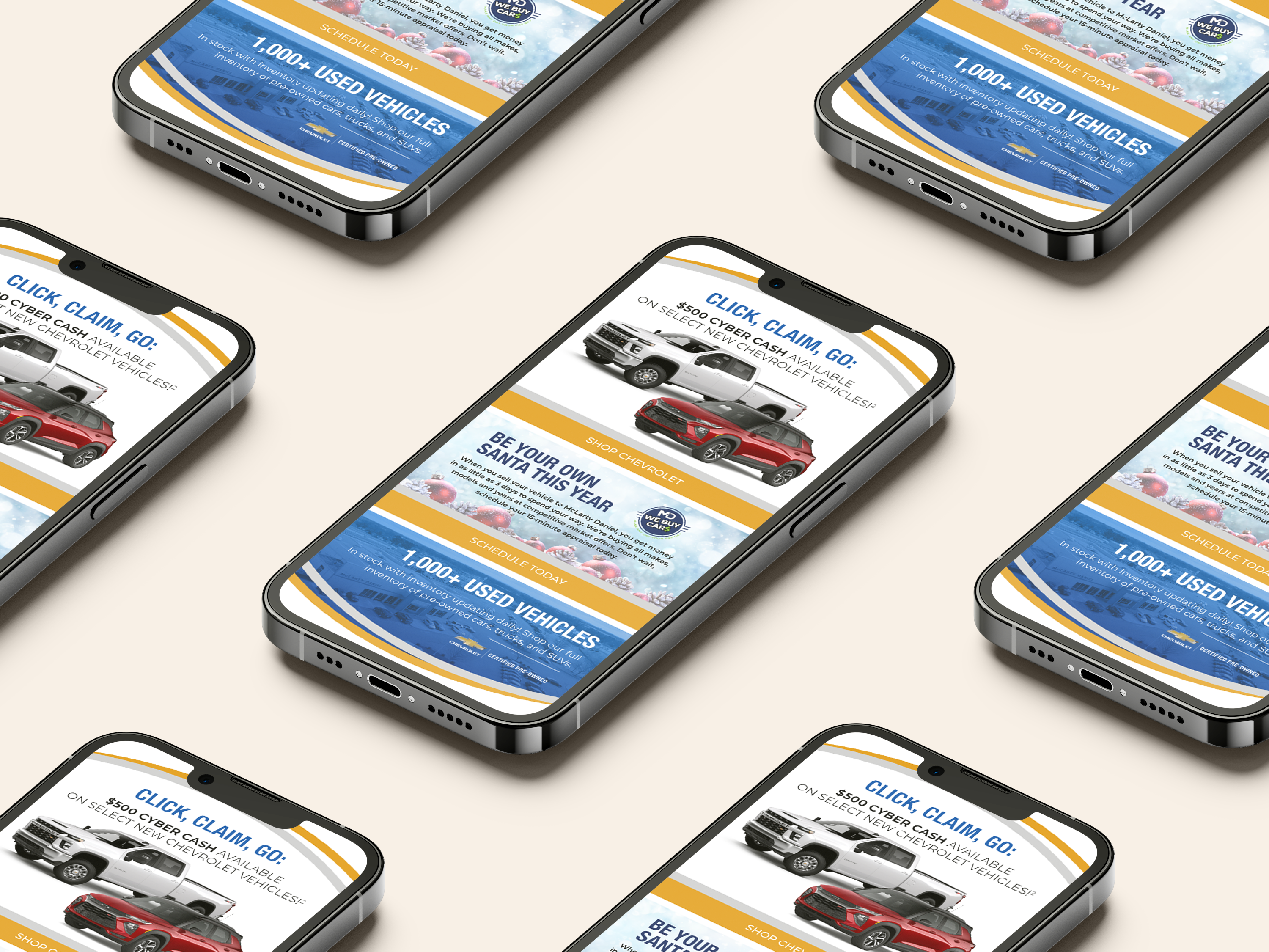 Introducing the McLarty Daniel Car Dealerships bi-monthly email campaigns: Tailored to each dealership’s unique brand guidelines, these fully customized emails captivate with clean layouts and elegant typography, accentuating the allure of luxurious offers and stunning car visuals.